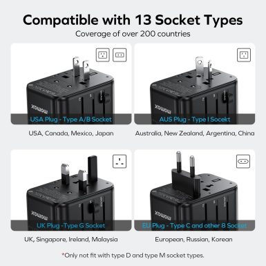 MOMAX Universal Travel Adapter, GaN 70W International Power Adapter, 3 USB-C PD Fast Charging & 2 USB-A QC, 1 AC, All-in-one International Plug Adapter for Travel European UK AUS JP